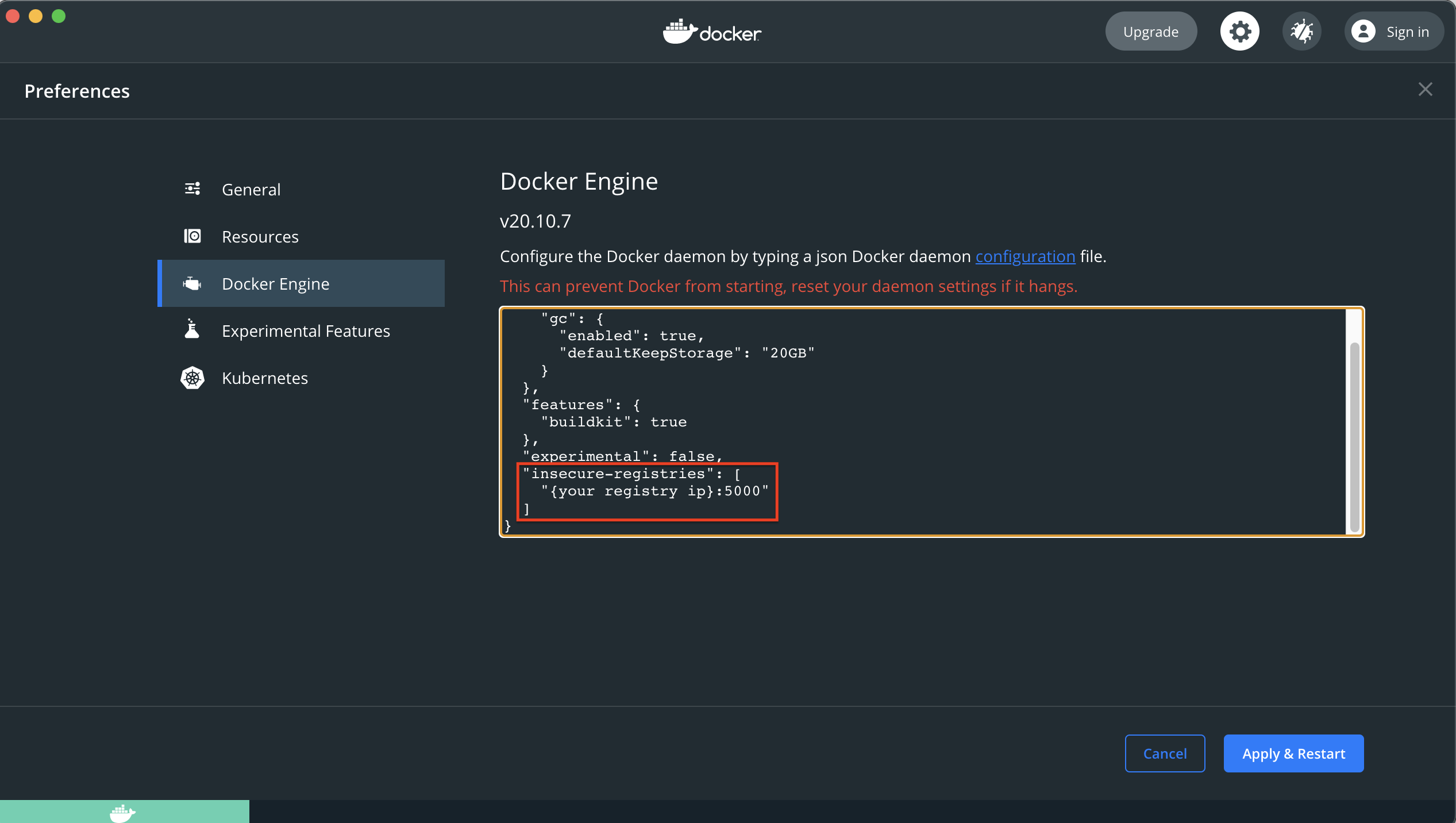 docker registry 로 부터 pull을 하는 경우 기본적으로 SSL 인증이 필요하나 테스트 이므로 예외처리가 필요하다.