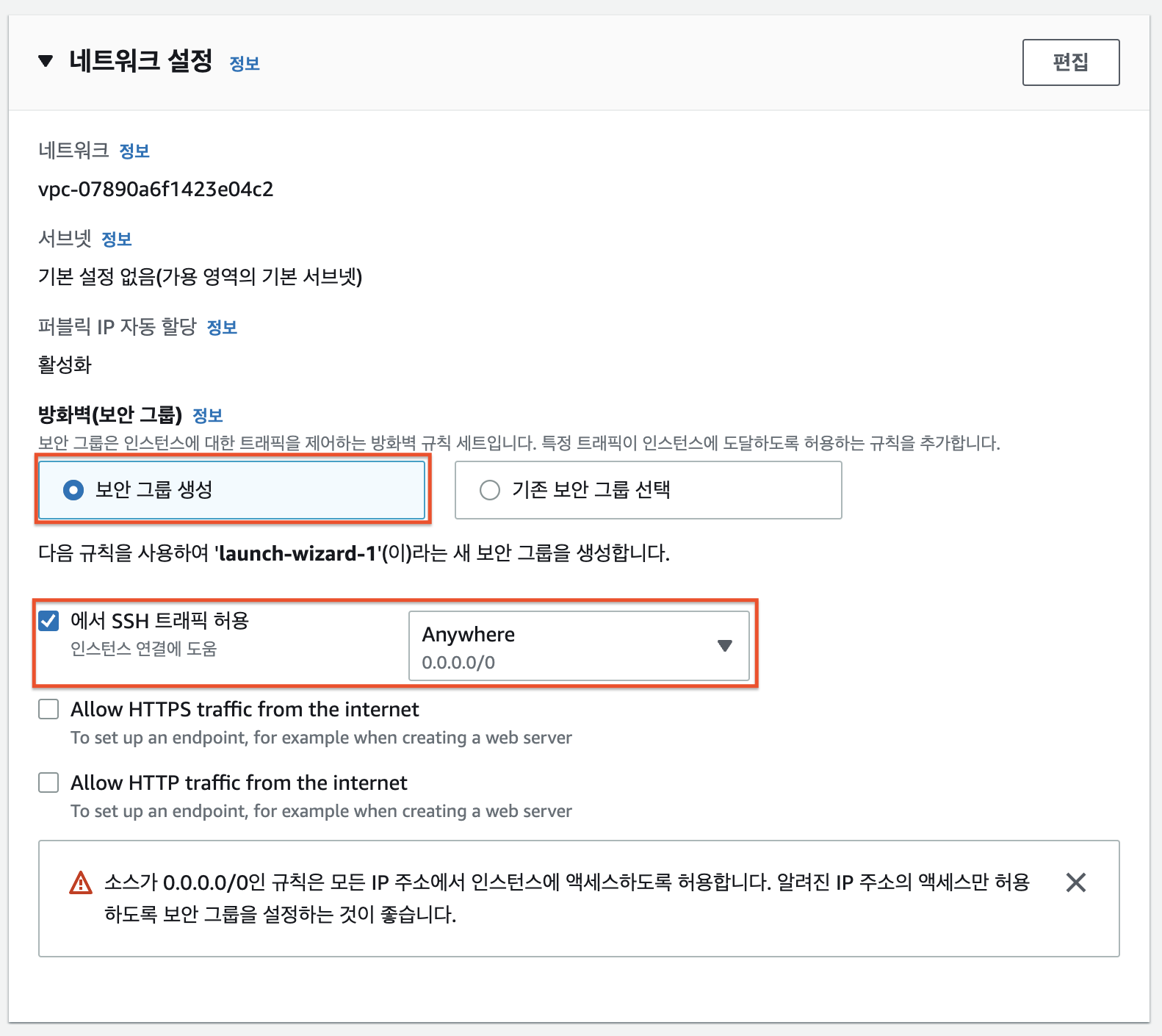 접근 권한은 AnyWhere 또는 본인 IP를 선택하여 규칙을 저장한다.