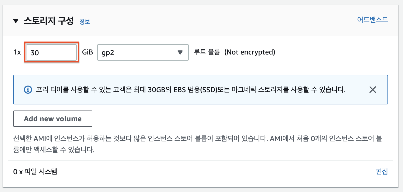 스토리지 용량을 8Gib 에서 30Gib로 변경해 준다. (30Gib 까지 무료임)