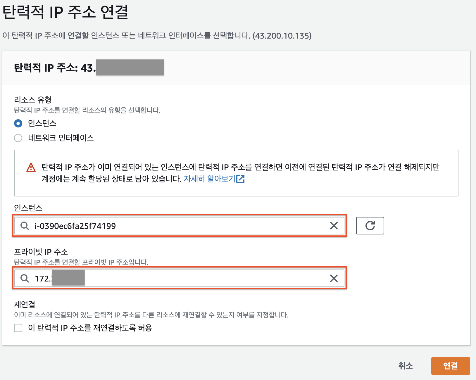 탄력적 IP를 생성된 instance와 연결 해준다.