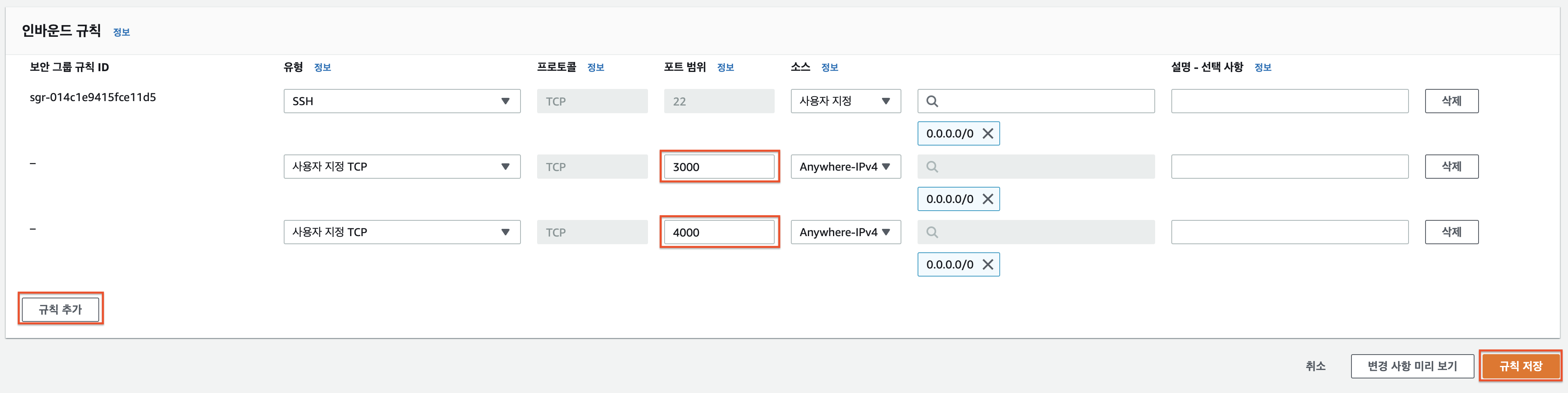 규칙 추가를 클릭하여 3000, 4000 포트를 추가해 준다.