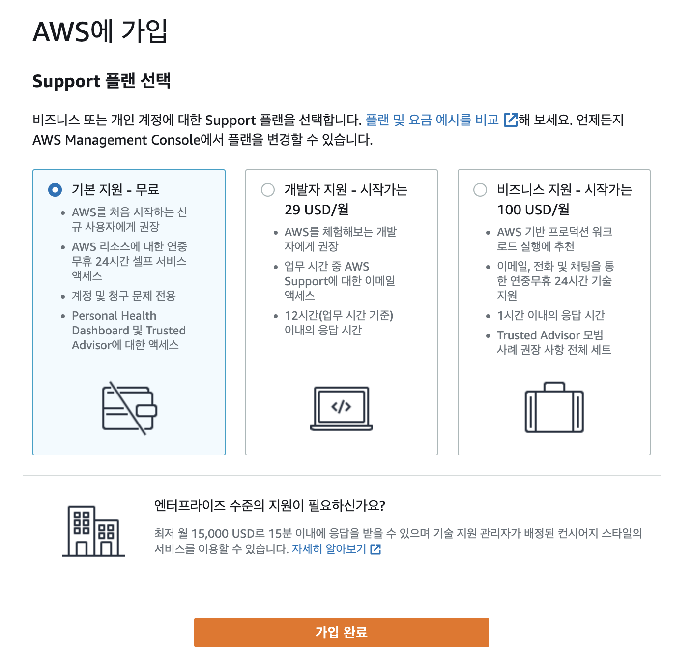 앞선 인증 단계를 거친 후 Support Plan 선택 단계에서 기본 지원 - 무료를 선택한다.