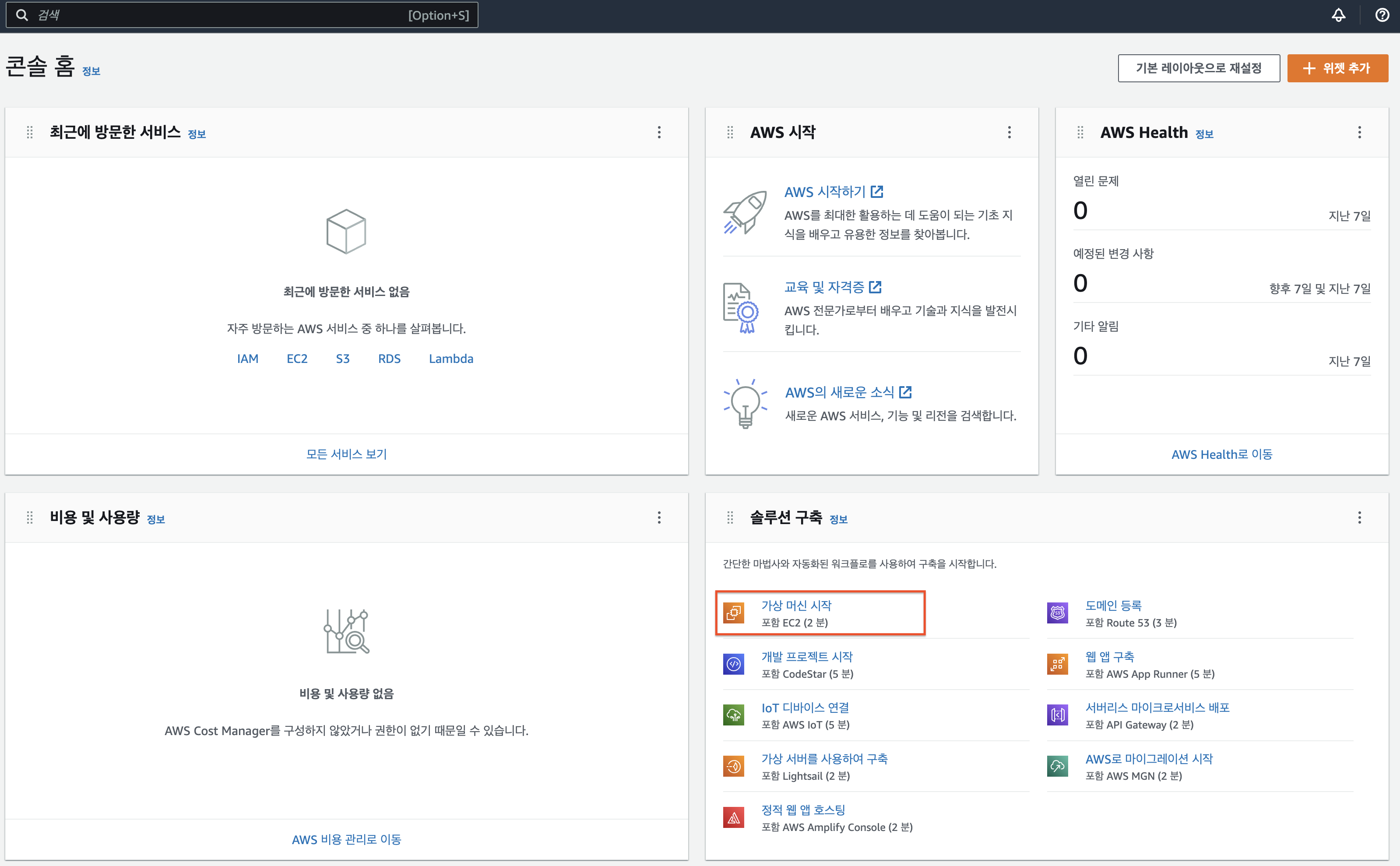 이제 VM(EC2) 을 생성하자. 메인 대시보드 화면에서 가상 머신 시작을 클릭하여 새로운 VM을 만들자.