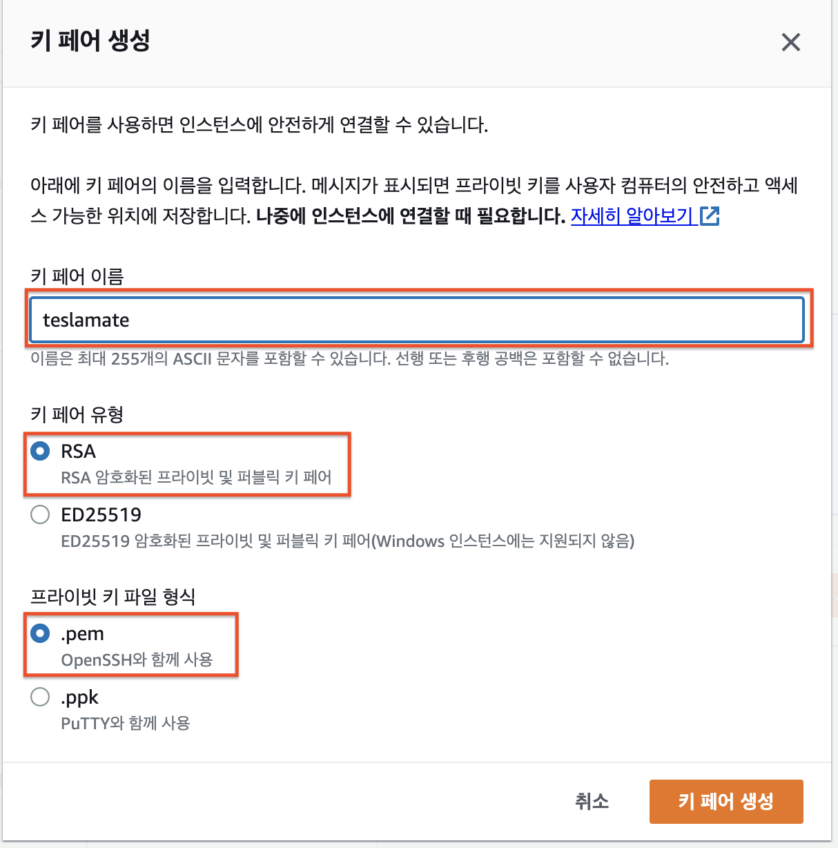 키 페어 이름, 유형, 파일 형식을 선택한다.